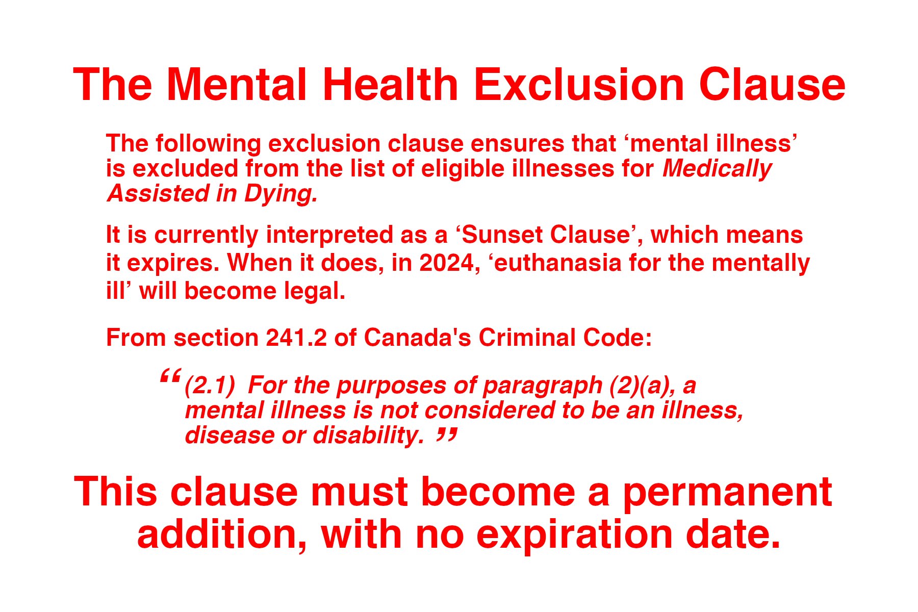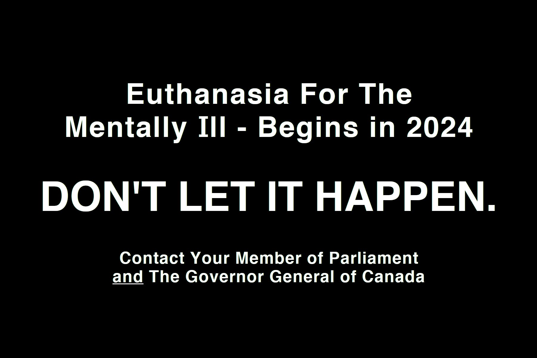 Back in March I was making a coffee in my kitchen and just happened to hear these words coming from the TV: "Medically Assisted Dying option for Mentally Ill people has been postponed until 2024." My jaw droppd, I turned to my mother and asked her if she heard the same thing I did. WTF? As far as I knew it was never included! WE DON'T DO THAT IN CANADA! Before I explain how this happened, here is the solution. Read the text in the image, this is how we prevent it. CONTACT YOUR MEMBER OF PARLIAMENT and explain that Medically Assisted In Dying is not an option for the Mentally Ill. What you read in the image below, will prevent it from becoming legal in 2024. What's next, Disabilities? Genetic Inferiority? Race?